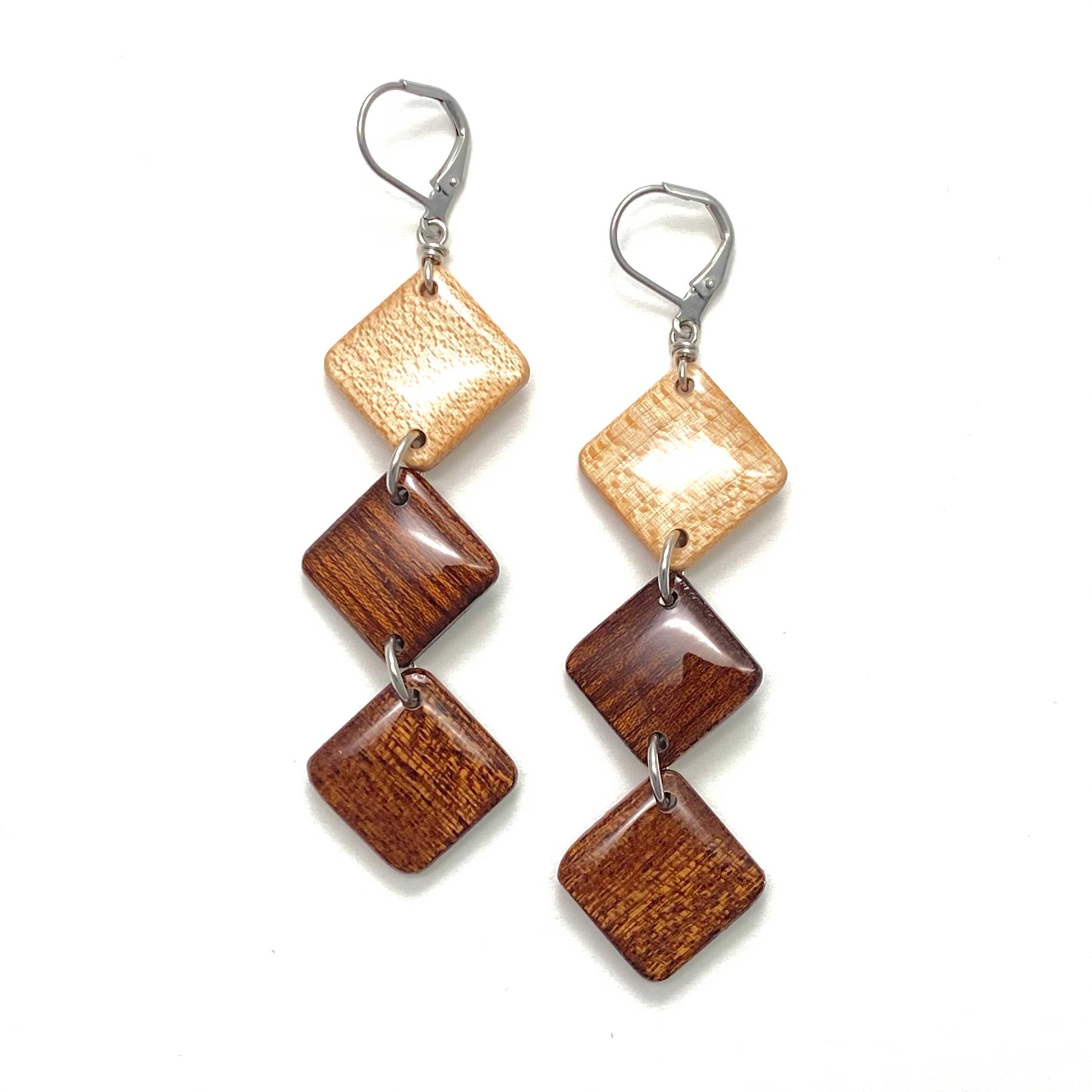 Bold and lightweight, these reclaimed wood earrings are designed to make a statement without weighing you down. Each handmade earring highlights the natural colors and textures of the wood, finished with a resin coating that adds a touch of shimmer to every piece. Express your style with a piece that’s as sustainable as it is striking.