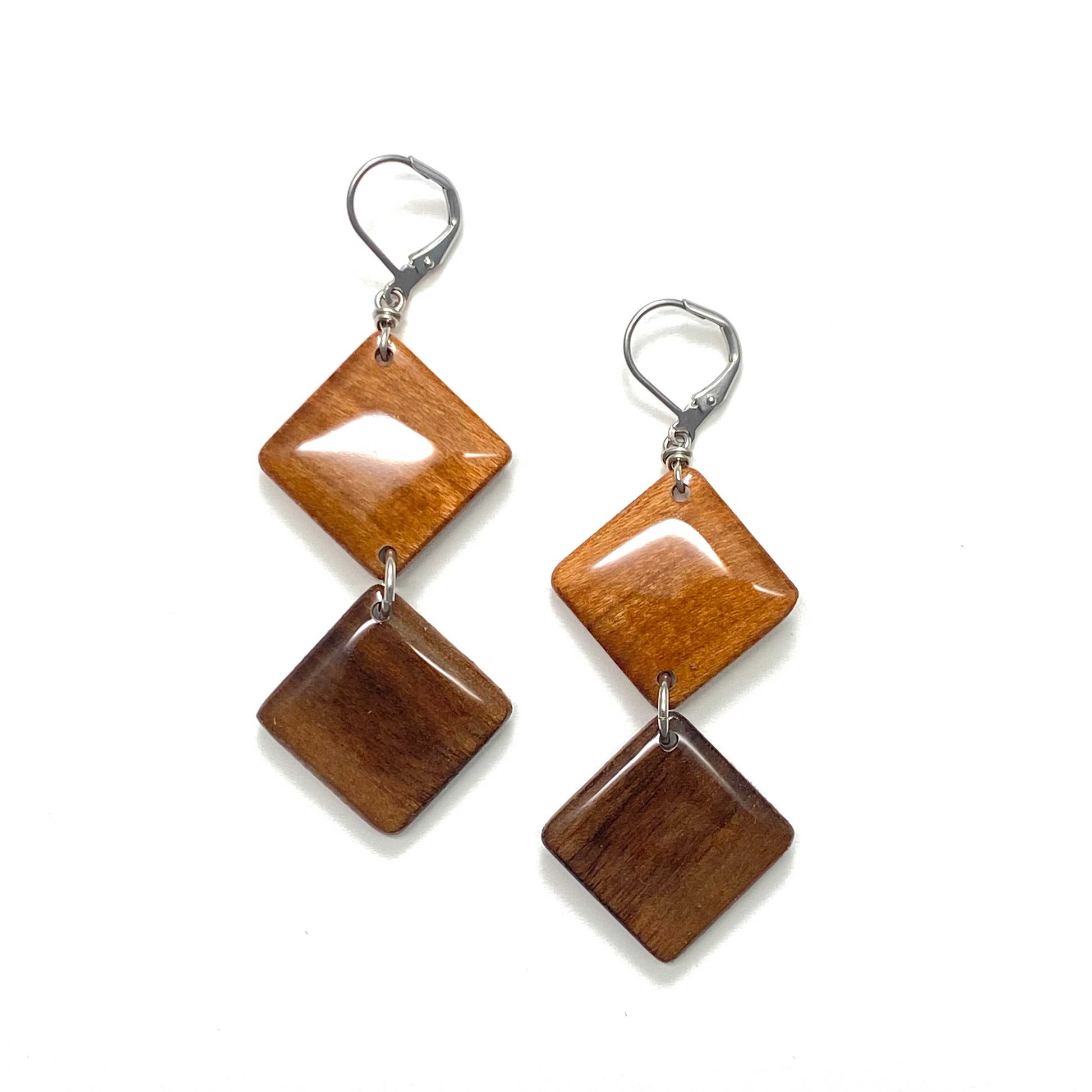 Versatile and eye-catching, these reclaimed wood earrings strike the perfect balance between casual charm and refined elegance. Each handmade earring highlights the natural colors and textures of the wood, finished with a resin coating that adds a touch of shimmer to every piece. A timeless design that transitions seamlessly from day to night.