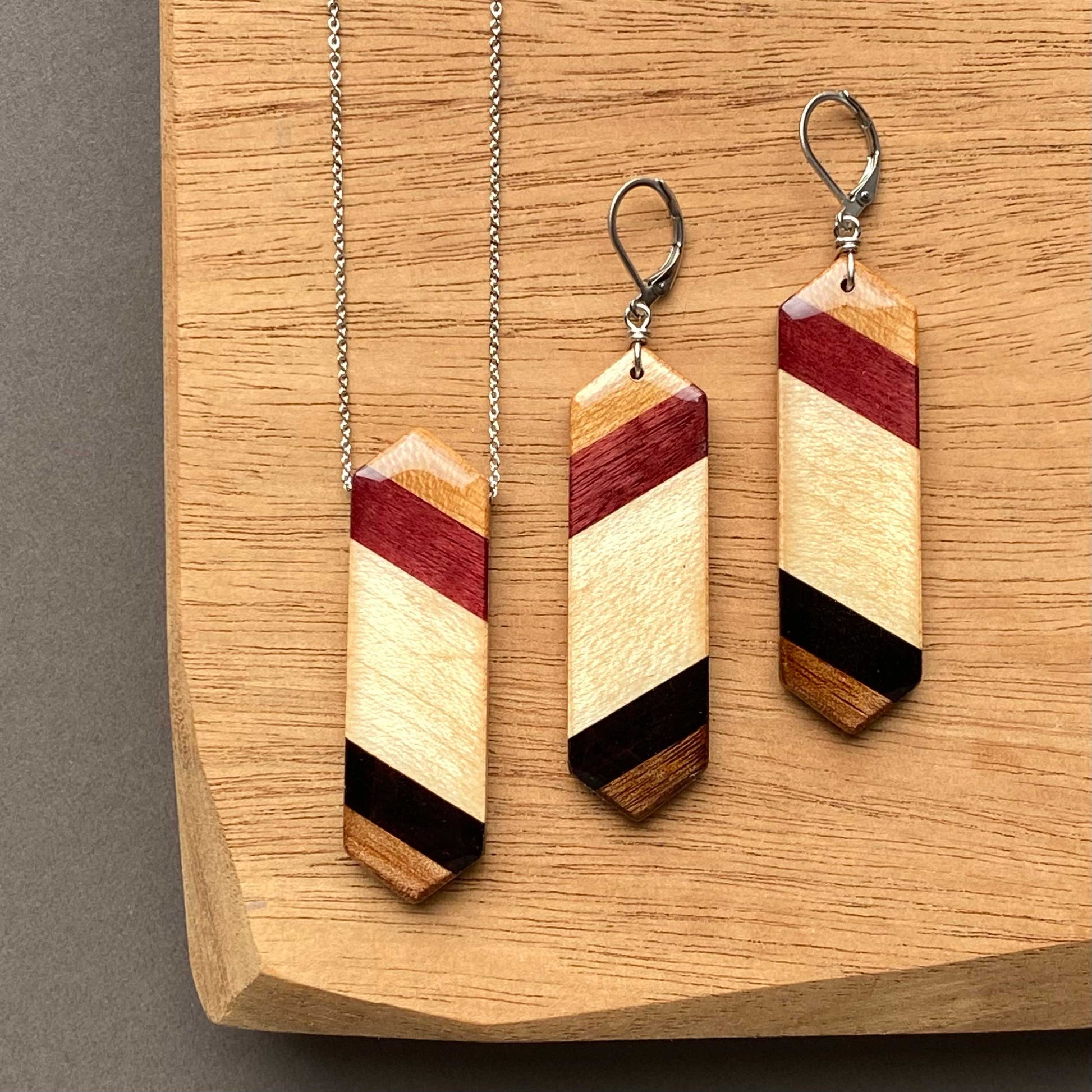 I dig through scraps from my husband's woodworking shop to find the coolest wood combinations for each piece of jewelry.