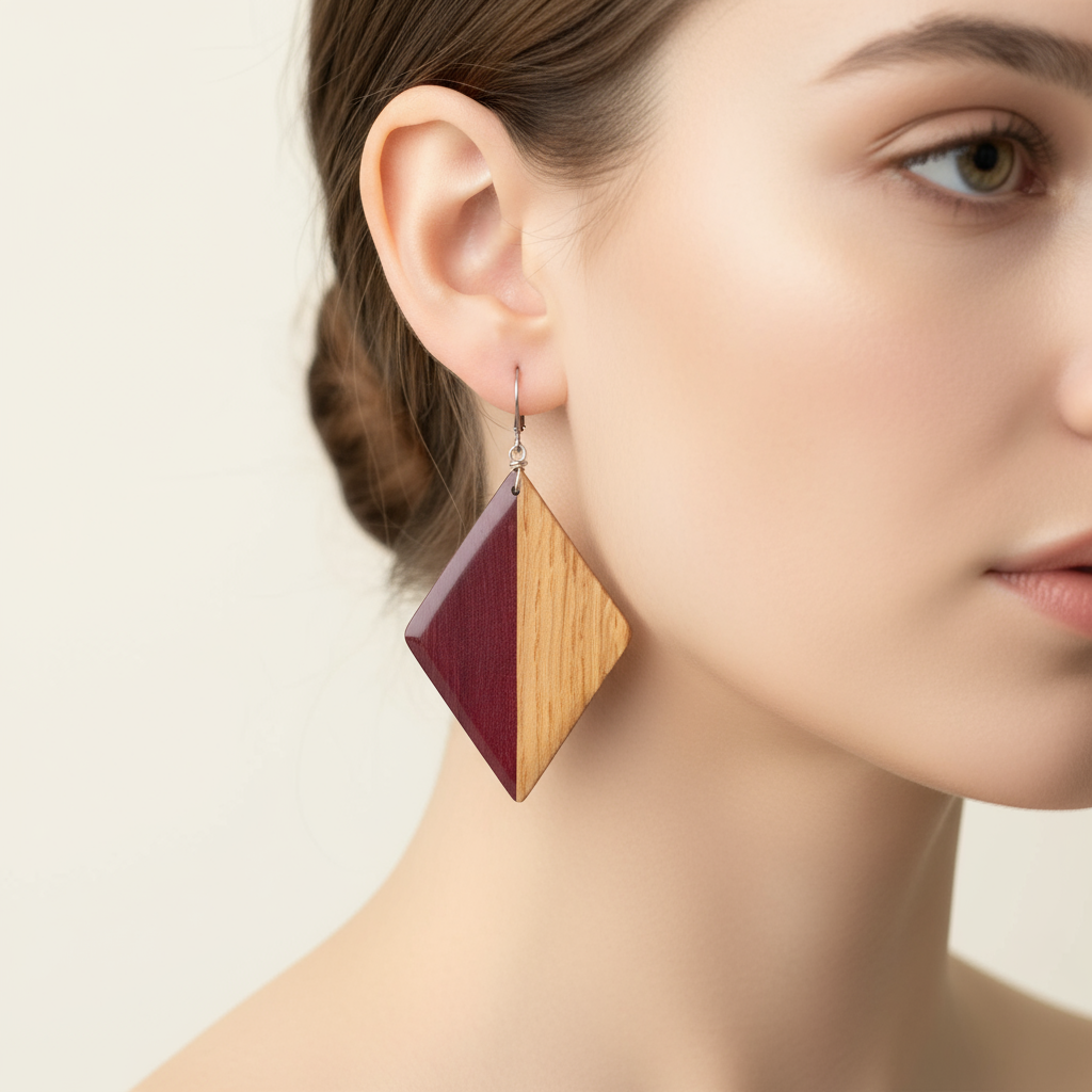 Bold and lightweight, these reclaimed wood earrings are designed to make a statement without weighing you down. Each handmade earring highlights the natural colors and textures of the wood, finished with a resin coating that adds a touch of shimmer to every piece. Express your style with a piece that’s as sustainable as it is striking.