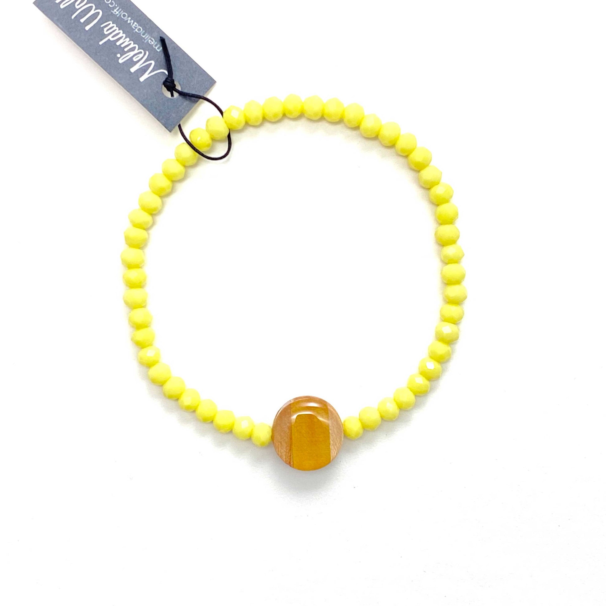 Simple and versatile, this stretch beaded bracelet is designed for everyday comfort and style. It features a handmade reclaimed wood bead finished with a resin coating that adds a touch of shimmer. Surrounded by yellow-colored glass beads and crafted with a flexible stretch band, it’s perfect worn solo or stacked for a layered look.