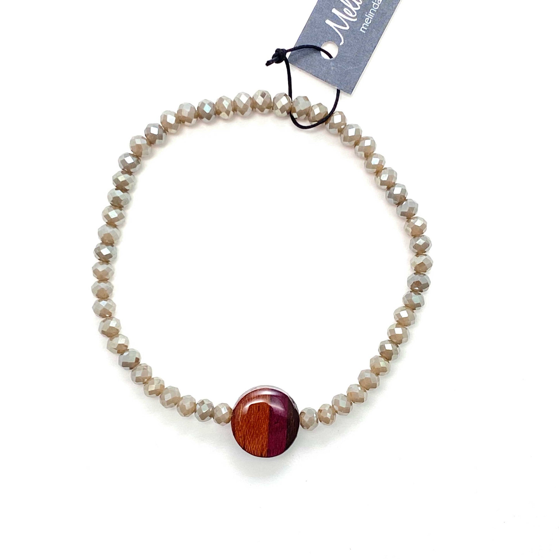 Simple and versatile, this stretch beaded bracelet is designed for everyday comfort and style. It features a handmade reclaimed wood bead finished with a resin coating that adds a touch of shimmer. Surrounded by grey-colored glass beads and crafted with a flexible stretch band, it’s perfect worn solo or stacked for a layered look.