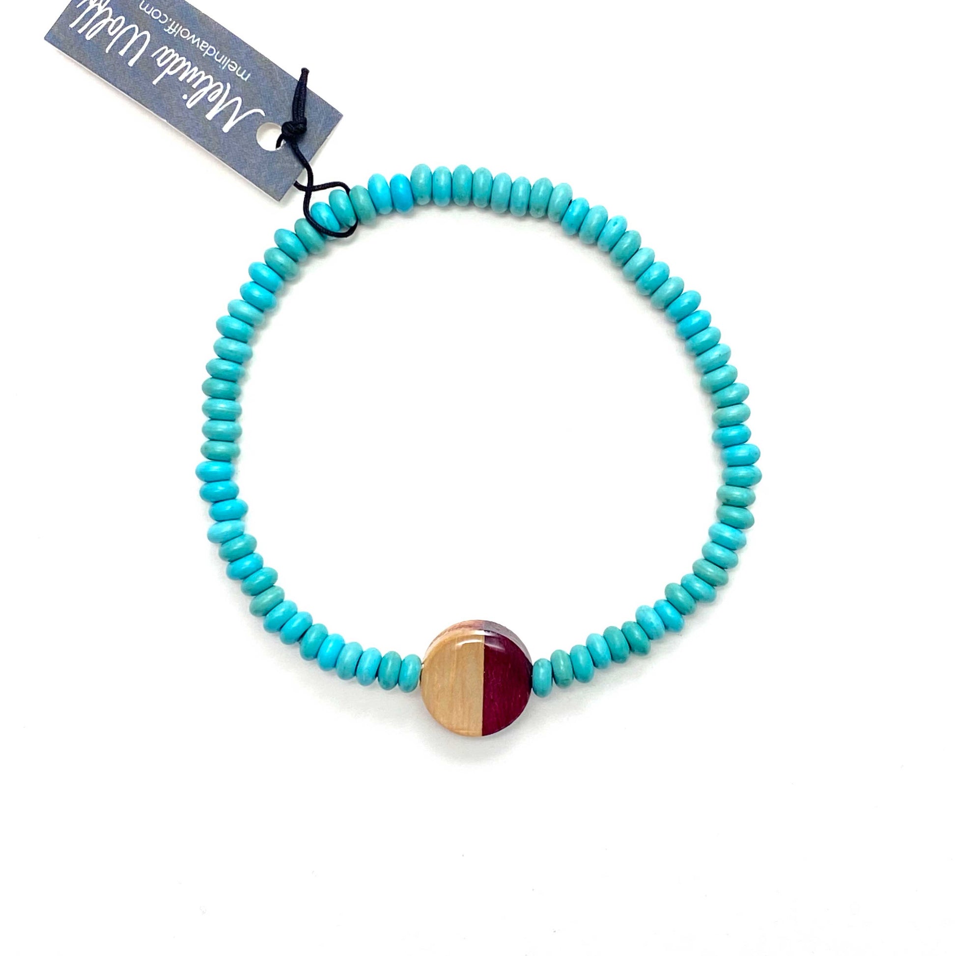 Simple and versatile, this stretch beaded bracelet is designed for everyday comfort and style. It features a handmade reclaimed wood bead finished with a resin coating that adds a touch of shimmer. Surrounded by turquoise-colored glass beads and crafted with a flexible stretch band, it’s perfect worn solo or stacked for a layered look.