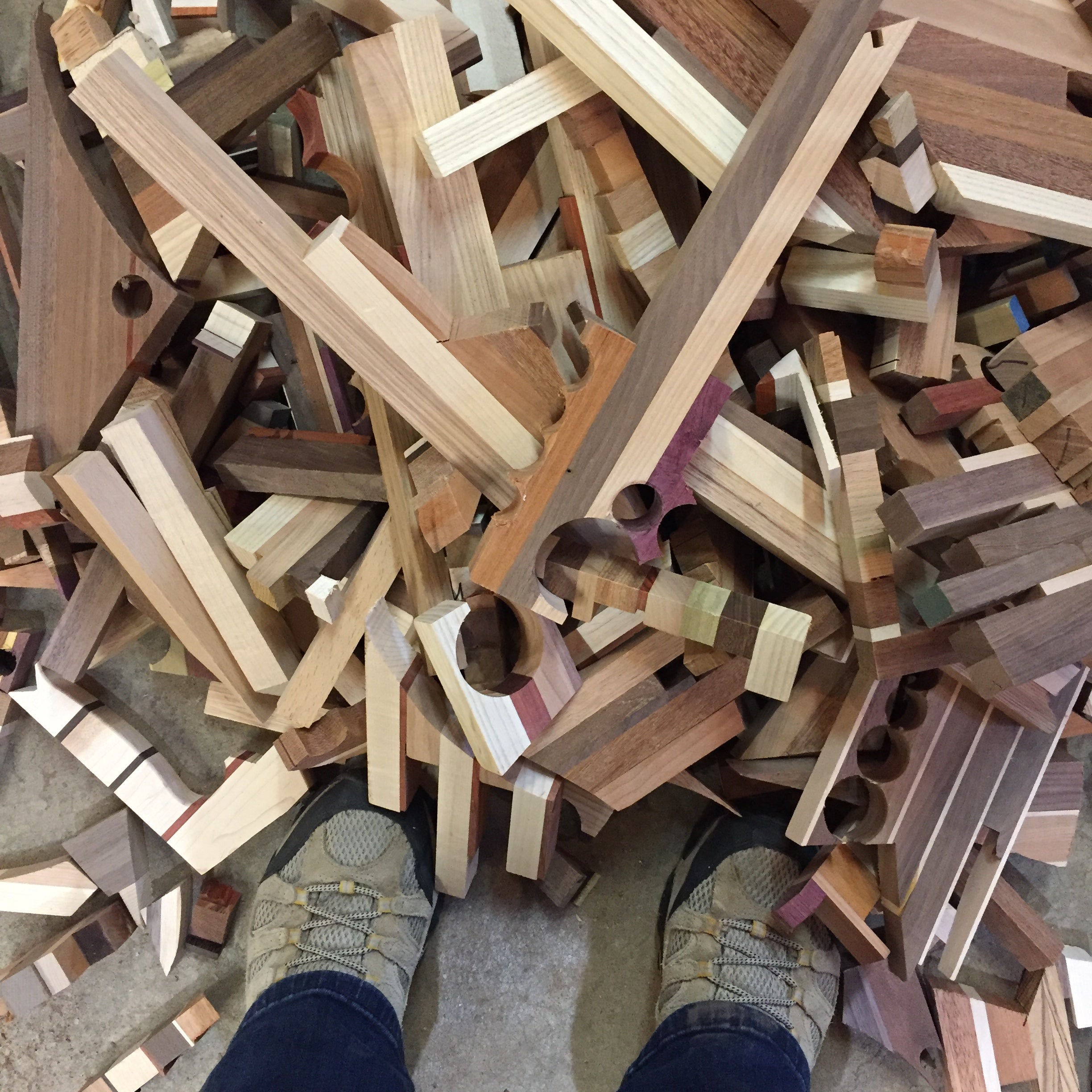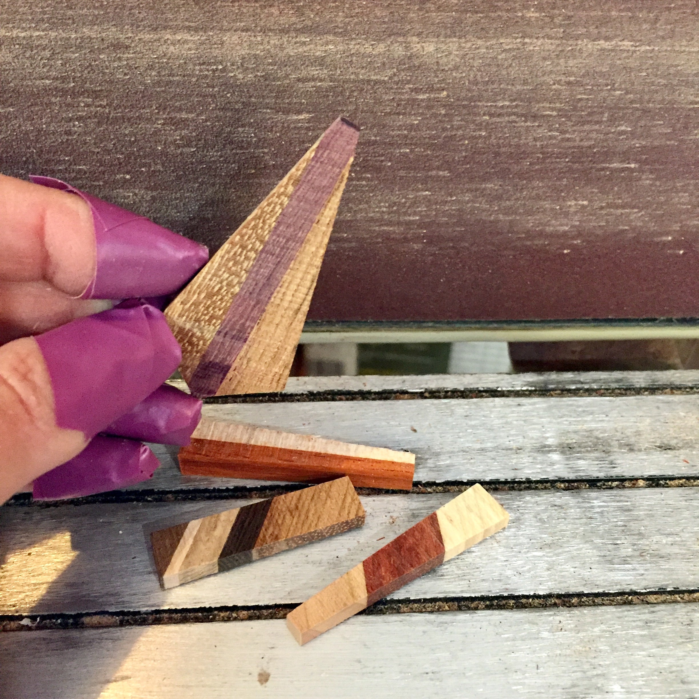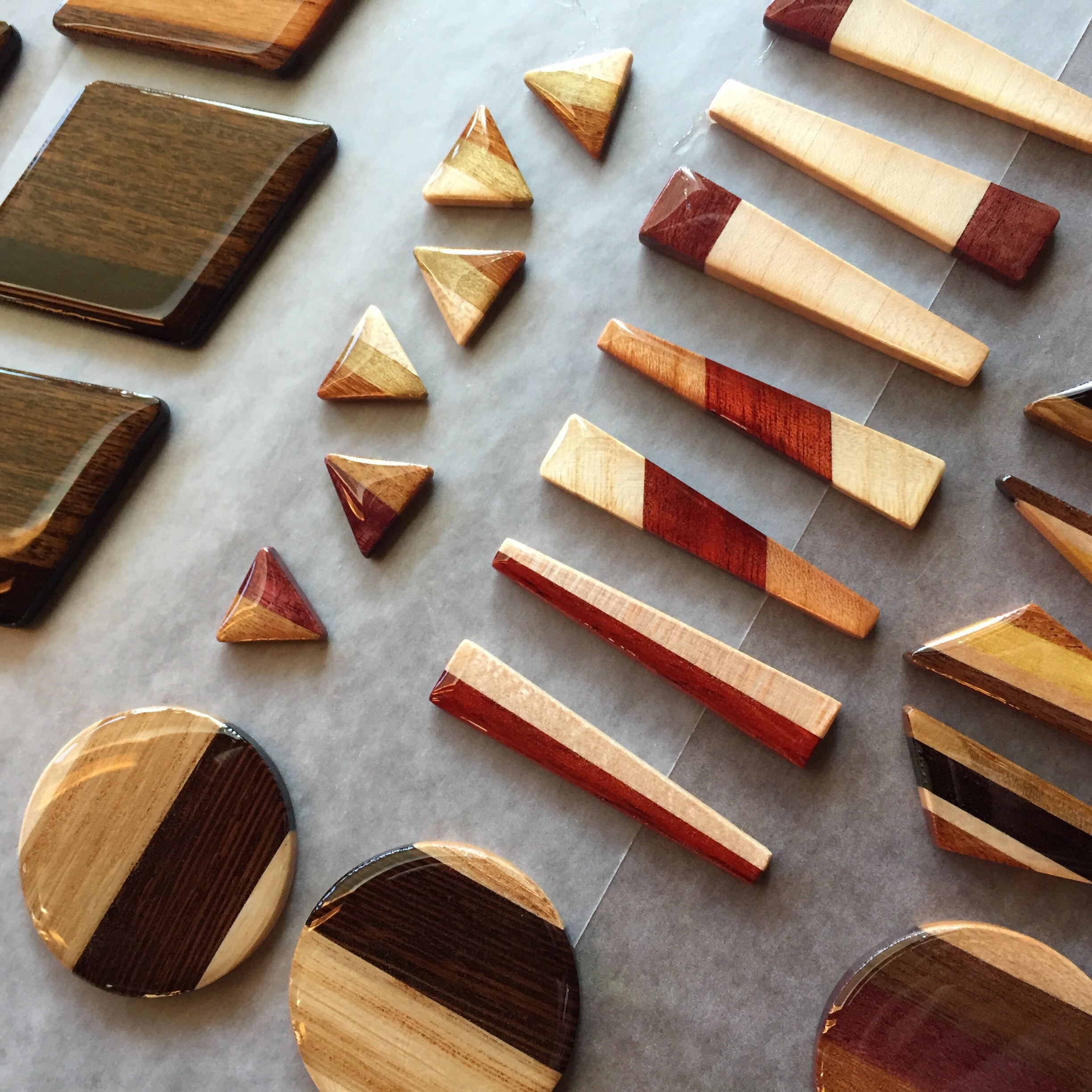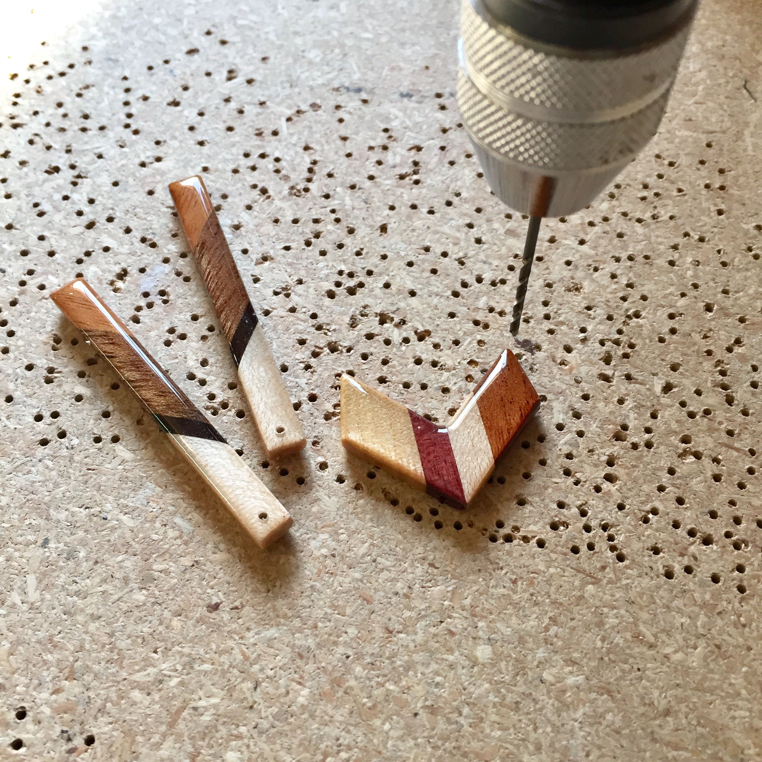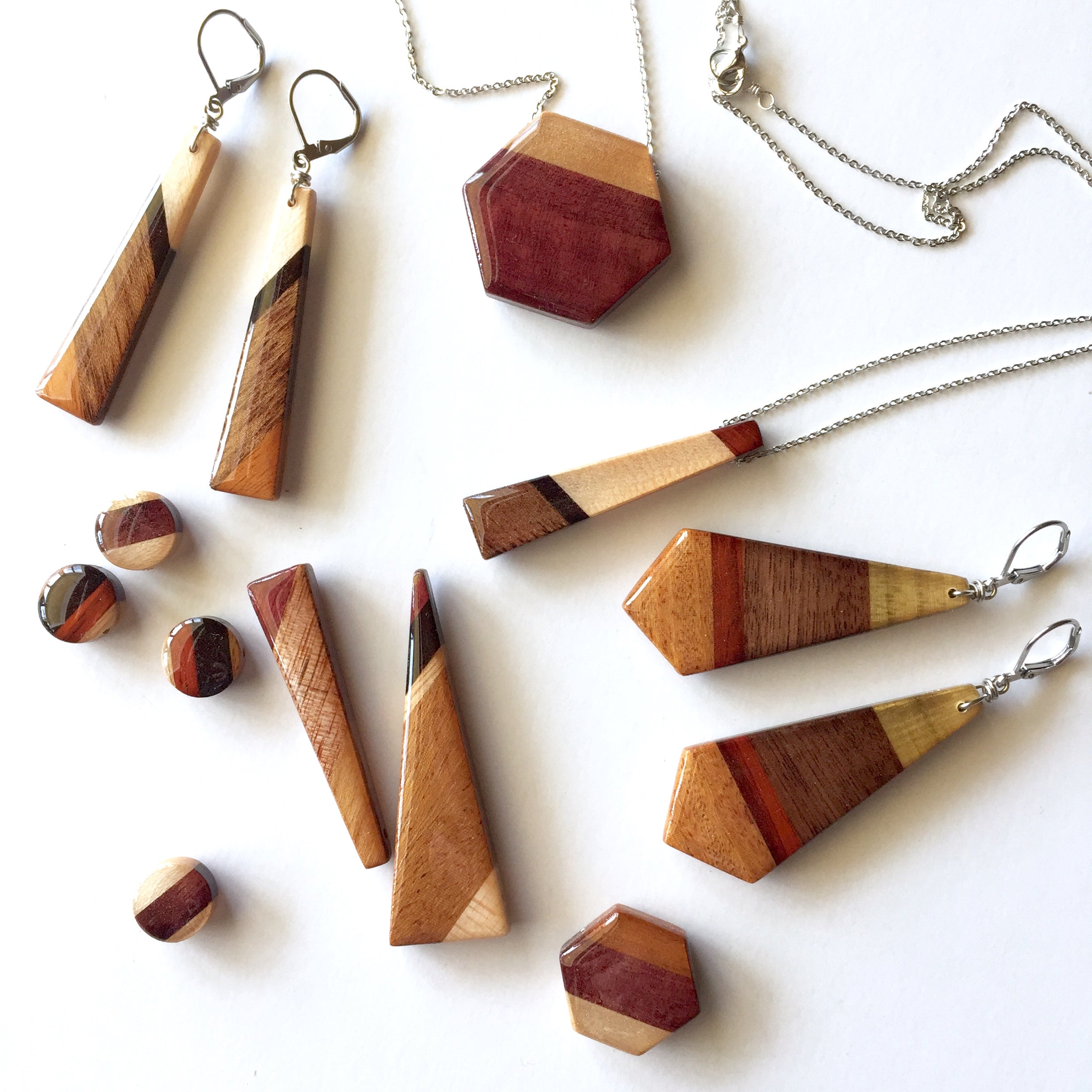 I dig through scraps from my husband's woodworking shop to find the coolest wood combinations for each piece of jewelry.