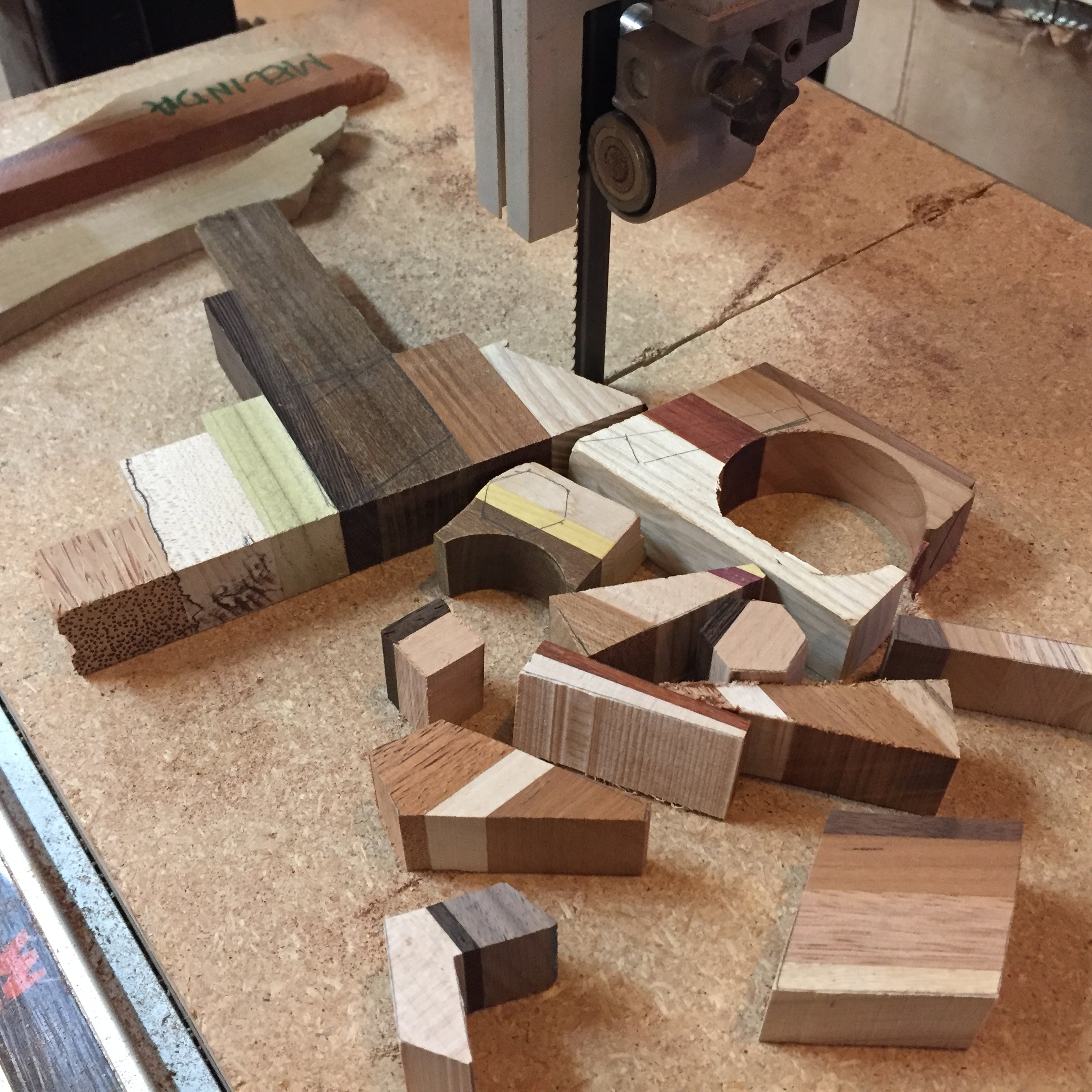 Next, I slice the shapes into thinner pieces using the band saw. Push sticks keep my fingers far from the blade.