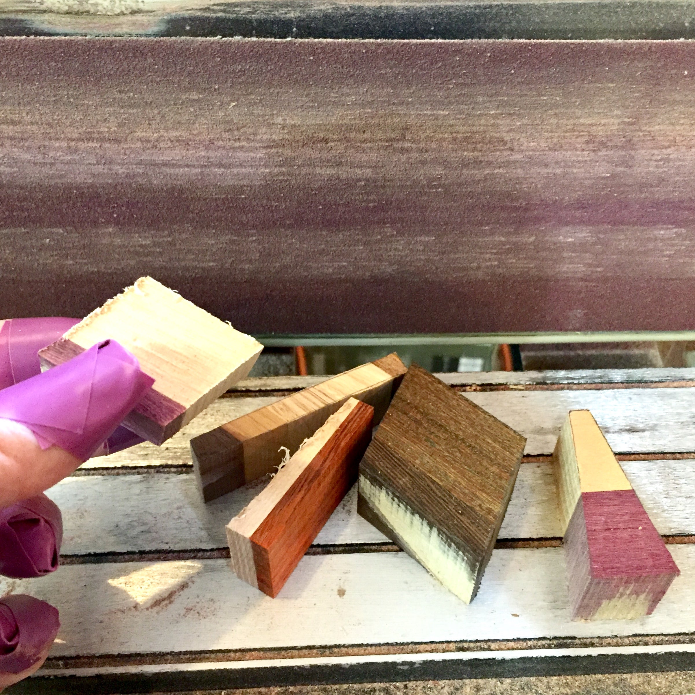 Back to the belt sander to remove saw marks from the freshly sliced pieces. Taped fingers are a must for this step!