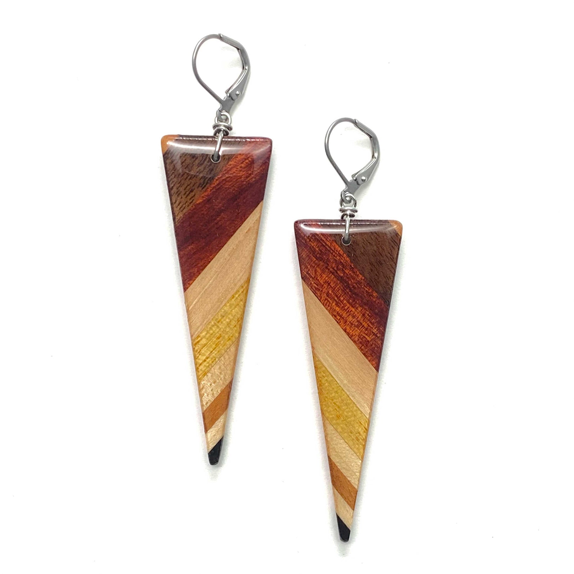 With a 2 1/2” wood dangle, these reclaimed wood earrings are bold, lightweight, and make a statement. The simple geometric design highlights the natural colors and textures of the wood, finished with a resin coating that adds a touch of shimmer to each piece. Earrings are made with Cherry, Walnut, Bloodwood, Hickory, Yellow Heart, Maple, and Wenge woods, finished with a surgical steel ear wire (nickel free).